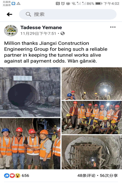 參觀結(jié)束時(shí),Tadesse先生由衷感謝大家的辛勤付出,對項(xiàng)目部順利完成隧洞首倉襯砌砼表示高度贊許,并相信項(xiàng)目部一定能保質(zhì)保量完成隧洞二期襯砌施工。Tadesse先生還在Facebook(臉書)平臺分享了本次隧洞參觀的經(jīng)歷,并表達(dá)了對我公司作為戰(zhàn)略合作伙伴的充分信任。