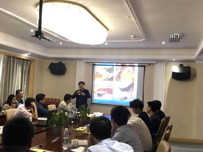 現(xiàn)場參觀結(jié)束后,學(xué)習(xí)團(tuán)參加了技術(shù)培訓(xùn)和經(jīng)驗(yàn)交流會??偨?jīng)理助理杜凌主持了開班儀式。總工程師胡鴻煌、項(xiàng)目副經(jīng)理李成,對洋前壩水庫的大壩總布置、大壩施工導(dǎo)流、大壩及供水管道施工技術(shù)細(xì)節(jié)等,通過文字、圖片、視頻等組成的PPT課件為學(xué)員授課,并就學(xué)員提出的問題逐一進(jìn)行了解答。