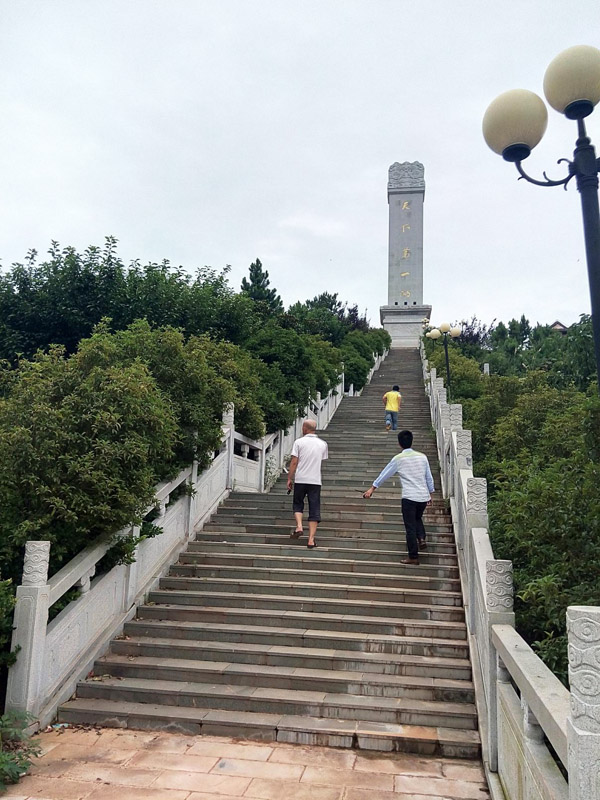 除了饒娥像,其對(duì)面的斗笠山也是美景所在之處。入山前,首先看到的是一條由青石板鋪成的臺(tái)階,臺(tái)階蜿蜒陡峭,兩側(cè)是漢白玉雕欄,欄上雕龍繪鳳,栩栩如生。抬頭仰望,只見臺(tái)階盡頭是一座高聳的石碑,燙金而書“天下第一碑”幾個(gè)大字。一路走走停停到了石碑前,眼前豁然開朗,放眼瞭望,到處一片茫茫水面,碧波蕩漾,翻起碎玉點(diǎn)點(diǎn)。窮極目力,水天一線之間,一座三角錐狀燈塔若隱若現(xiàn),“浩渺鄱湖水接天,波翻浪涌競(jìng)爭(zhēng)先;連江通海胸懷廣,滋養(yǎng)生靈歲復(fù)年?!庇嗬系摹钝蛾栱灐氛\不欺我。臺(tái)階中央又有一小平臺(tái),連接至一片紅墻黃瓦的走廊,廊前紅墻上鑲嵌著墨色的石板,上面刻著一些當(dāng)代大家對(duì)鄱陽湖的見聞和贊譽(yù),筆走龍蛇,字體蒼勁,令人賞心悅目之時(shí)不免肅然起敬。走下斗笠山,已經(jīng)接近傍晚,金日西斜,站在饒娥像后眺望,湖面一片金鱗銀濤,美如油畫。