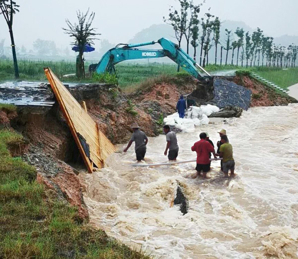 進入7月以來,昌江河流域普降暴雨,橋溪水河水位大漲。7月7日,公司接到業主汛情通報,已完工驗收工程多處出現險情;汛情就是命令,時間就是生命,公司迅速組建了一支裝備精良、經驗豐富的專業搶險突擊隊,由副總經理曾朝文、總經理助理杜凌帶隊,連夜奔赴浮梁抗洪一線,組織設備、人員、材料進場,進行搶險救災工作。